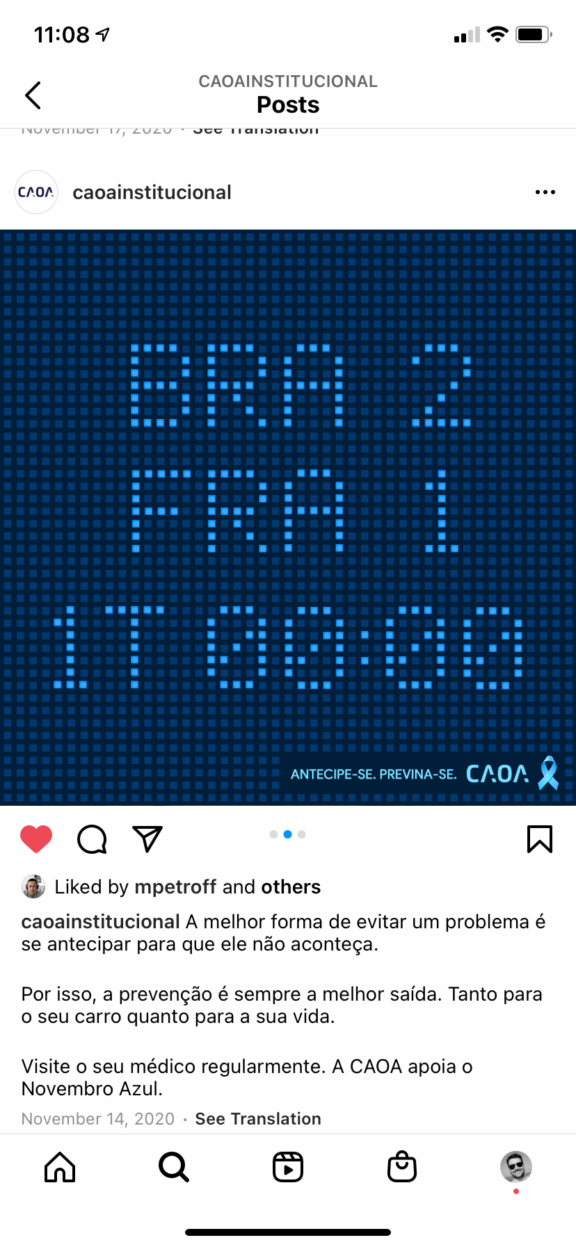 The best way to avoid a problem is to anticipate it so it doesn't happen. Therefore, prevention is the best way out. Both for your car and for your life. Visit your doctor regularly. CAOA supports the Blue November.